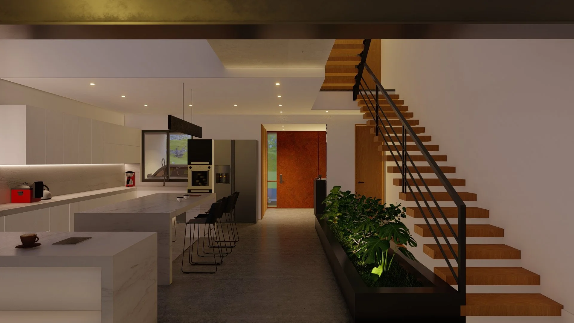 Priorizamos los espacios abiertos y dobles alturas en los interiores, dando la sensación de amplitud e interconexión entre las distintas áreas de la casa, propiciando la interacción social y la comunicación entre los espacios.